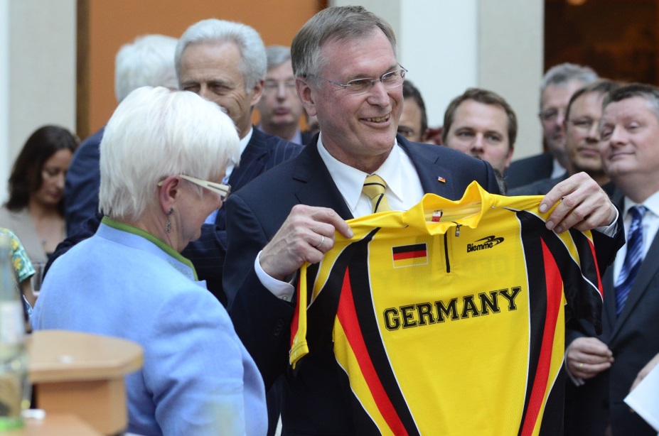 Zum 60.Geburtstag gratulierten der Unions-Fraktionsvorsitzende Volker Kauder und die CSU-Landesgruppenvorsitzende Gerda Hasselfeldt Johannes Singhammer. Bei einem Geburtstagsempfang bekam er von den CSU-Kollegen ein Radrennfahrer-Tricot in den Deutschland-Farben. Da Johannes Singhammer ein begeisterter Radler ist, war das sichtlich genau das richtige Geschenk.