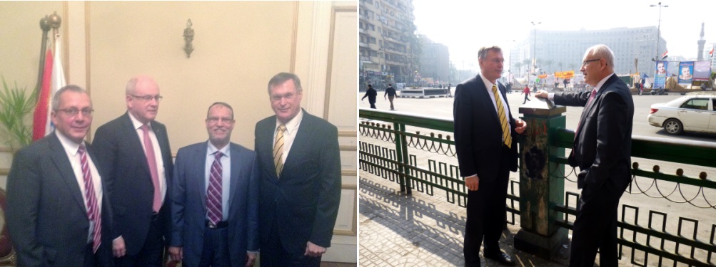 Vom 06. bis 08.02.2013 hielt sich Johannes Singhammer zusammen mit Unions-Fraktionsvorsitzenden Volker Kauder zu Gesprächen in Kairo auf. Im Mittelpunkt steht die freie Religionsausübung für Christen. Das linke Bild zeigt ein Gespräch mit den Vize-Präsidenten der Freedom&Justice Party Dr. Essam El-Erian und auf dem rechten Bild sind Johannes Singhammer und Volker Kauder auf dem Tahrir-Platz in Kairo.