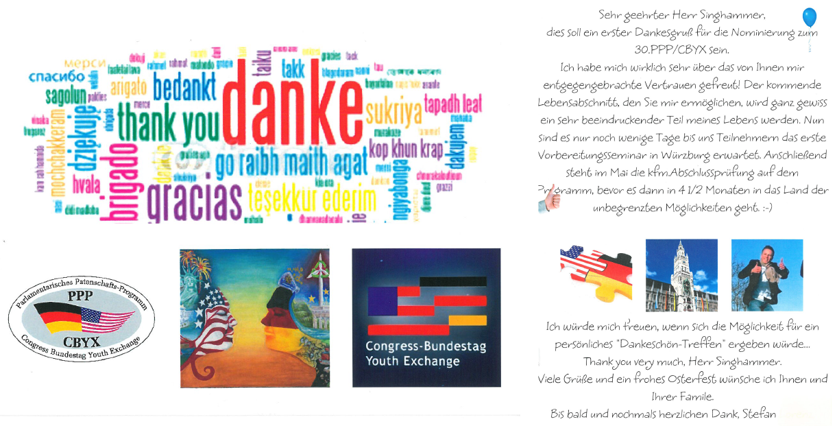 Aus dem Münchner Norden nimmt auf Einladung von Johannes Singhammer auch wieder ein Teilnehmer am Parlamentarischen Patenschaftsprogramm Deutscher Bundestag/US-Kongreß teil. Die Vorfreude ist schon groß...