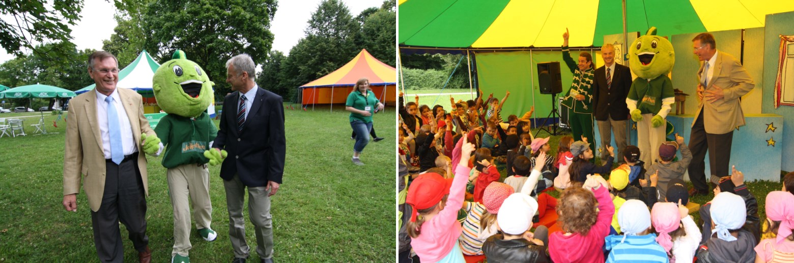 Johannes Singhammer besuchte am 11.Juli eine Aufführung des AOK-Kindertheaters Henrietta. Viel Spass für Jung und Alt mit AOK-Jolinchen rund um das Thema Prävention.