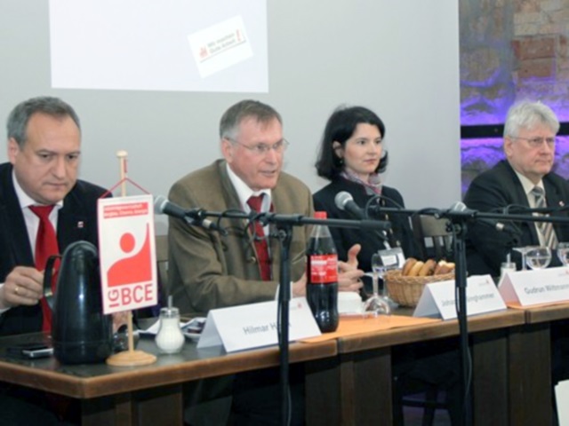 Eine lebendige Diskussion zum Thema "Arbeit und Mindestlohn " mit Hilmar Höhn, Leiter der Parlamentarischen Verbindungsstelle Berlin der IG BCE, MdB Johannes Singhammer, Gudrun Wittmann, Betriebsratsvorsitzende der Wacker Chemie AG, Consortium für elektrochemische Industrie und Egbert Biermann.