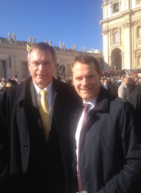 Am feierlichen Gottesdienst zur Amtseinführung des neuen Papstes Franziskus auf dem Petersplatz in Rom nahm Johannes Singhammer am Dienstag, den 19.März offiziell für die CDU/CSU-Bundestagsfraktion teil. Neben Johannes Singhammer ist Bundesgesundheitsminister Bahr zu sehen. Auf einem Empfang nach dem Gottesdienst sprach Johannes Singhammer mit dem Münchner Kardinal Marx und zusammen mit der Bundeskanzlerin mit Kardinal Lehmann. Johannes Singhammer hofft auf einen Besuch des neuen Papstes in Bayern und Deutschland. Weitere Infos unter "Medien / Pressemitteilungen".