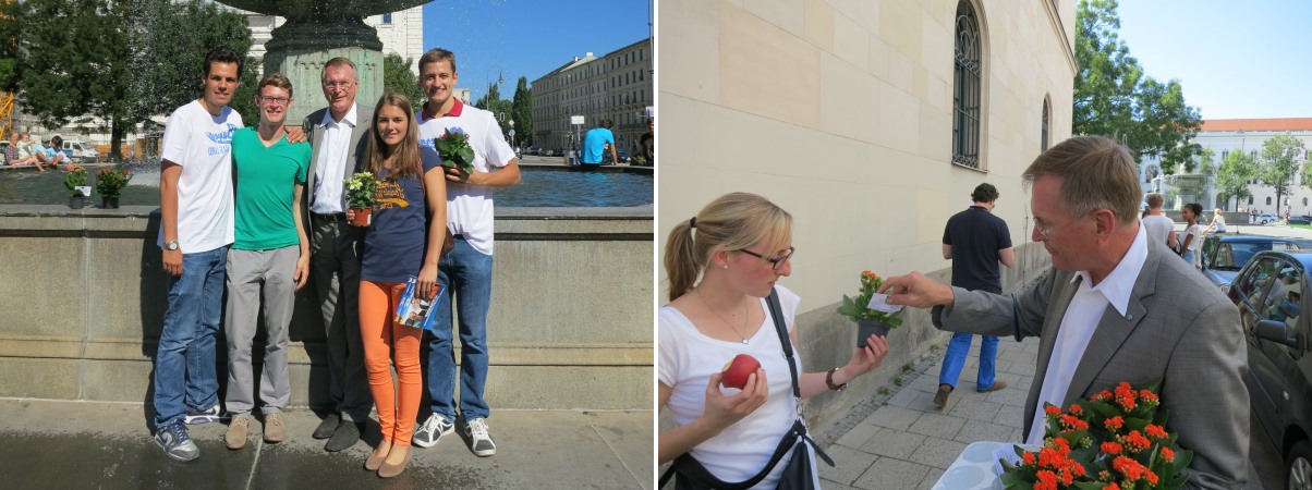 Die Junge Union München hat mit einen Infoaktion vor der Universität Johannes Singhammer im Wahlkampf unterstützt. Neben Informationsmaterial verteilte Johannes Singhammer Blumen.