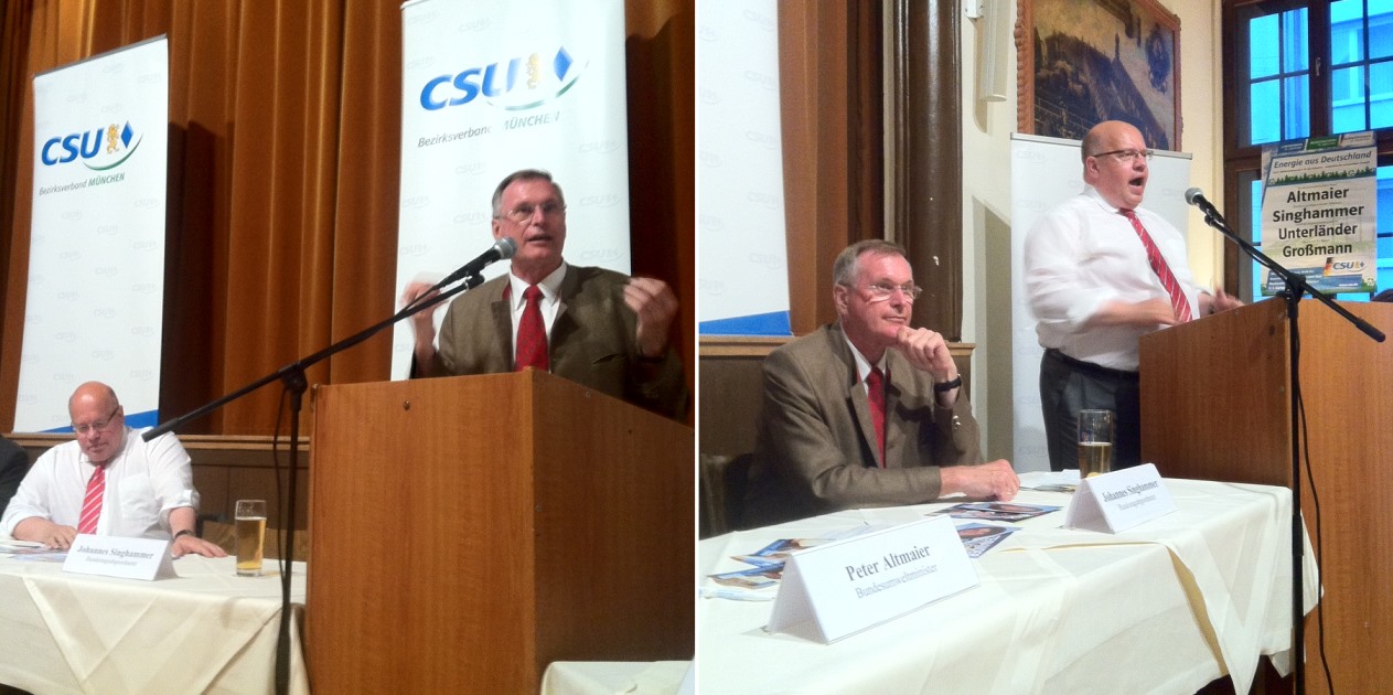 Johannes Singhammer spricht sich für die Nutzung der Erdwärme unter dem Münchner Stadtgebiet und für die Erzeugung von Sprit aus Biomasse wie Stroh und Laub aus. Bundesumweltminister Altmaier warb für einen abgestimmten und effizienten Einsatz der Erneuerbaren Energien.