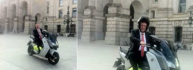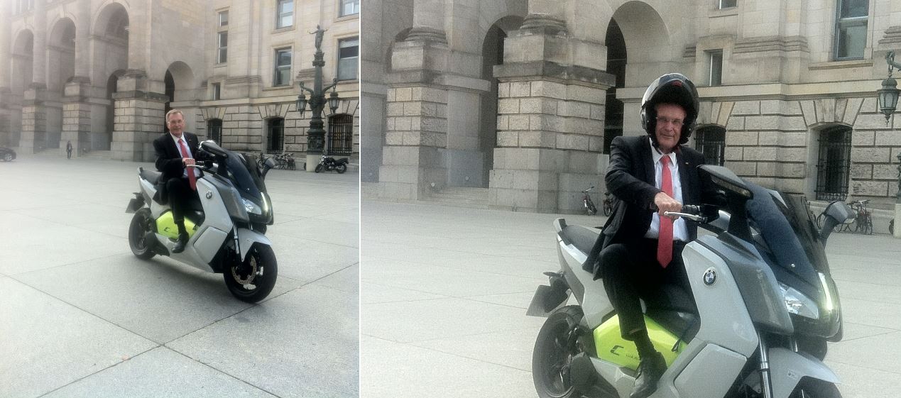 Mit einem Elektro-Motorrad kam Bundestagsvizepräsident Johannes Singhammer zum Berliner Reichstag. Er testete die Fahr- und Großstadttauglichkeit der neuen BMW C Evolution. Mit 120 km/h Spitzengeschwindigkeit und 100 km Reichweite ein ideales Stadtgefährt bei schönen Wetter. Und mit einem Verbrauch von 8 kWh für 100 km ein preisgünstiges und vor allem emissionsfreies Fahrvergnügen.