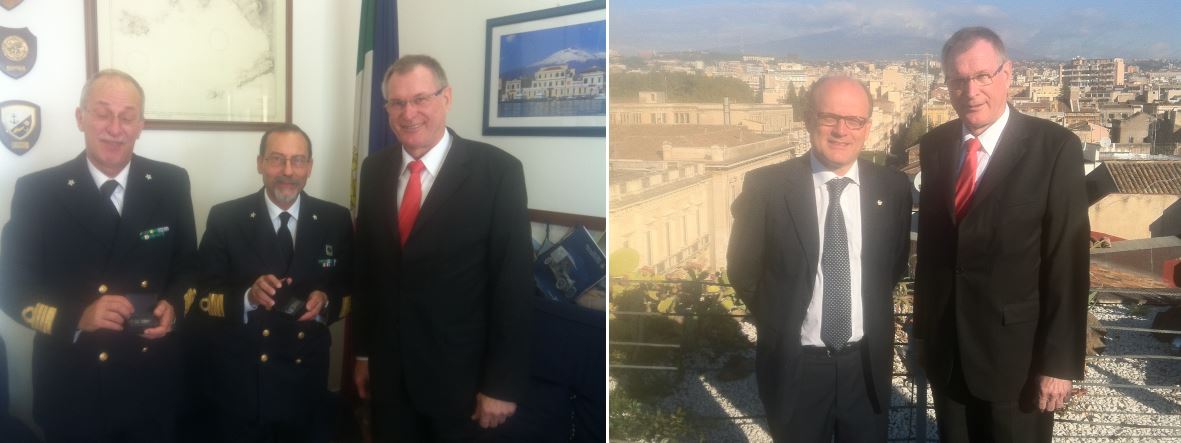 Bundestagsvizepräsident Johannes Singhammer führte am 30.10.2014 Gespräche mit der italienischen Küstenwache in Catania über die Operation Mare Nostrum, durch die Bootflüchtlinge gerettet werden. Der deutsche Honorarkonsul Dr. Turiaco begleitete ihn bei den Terminen.